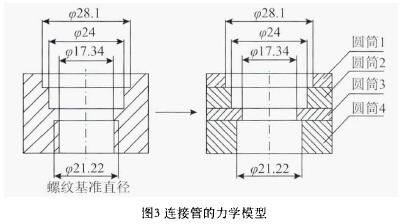 隨著內徑的變化,連接管實際上是由多個僅承受內壓的圓筒堆積而成,如圖3所示,自上而下,連接管可以近似看作是由內徑分別為¢18.1mm¢24mm¢17.34mm¢21.22mm4個圓筒粘接而成。