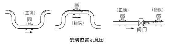 一是被測量的管道內必須完全充滿液體。重要的是,在任何時候,保持管道內完全充滿液體,否則流量顯示會受到影響,可能會導致測量誤差。具體安裝如下圖所示:
