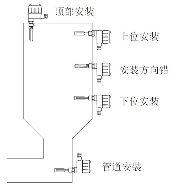 4、安裝在卸料斗內:料位開關螺牙底端與桶壁之間的最大距離不超過60mm,可避免因物料的不當堆積而發生誤報警的情況。
